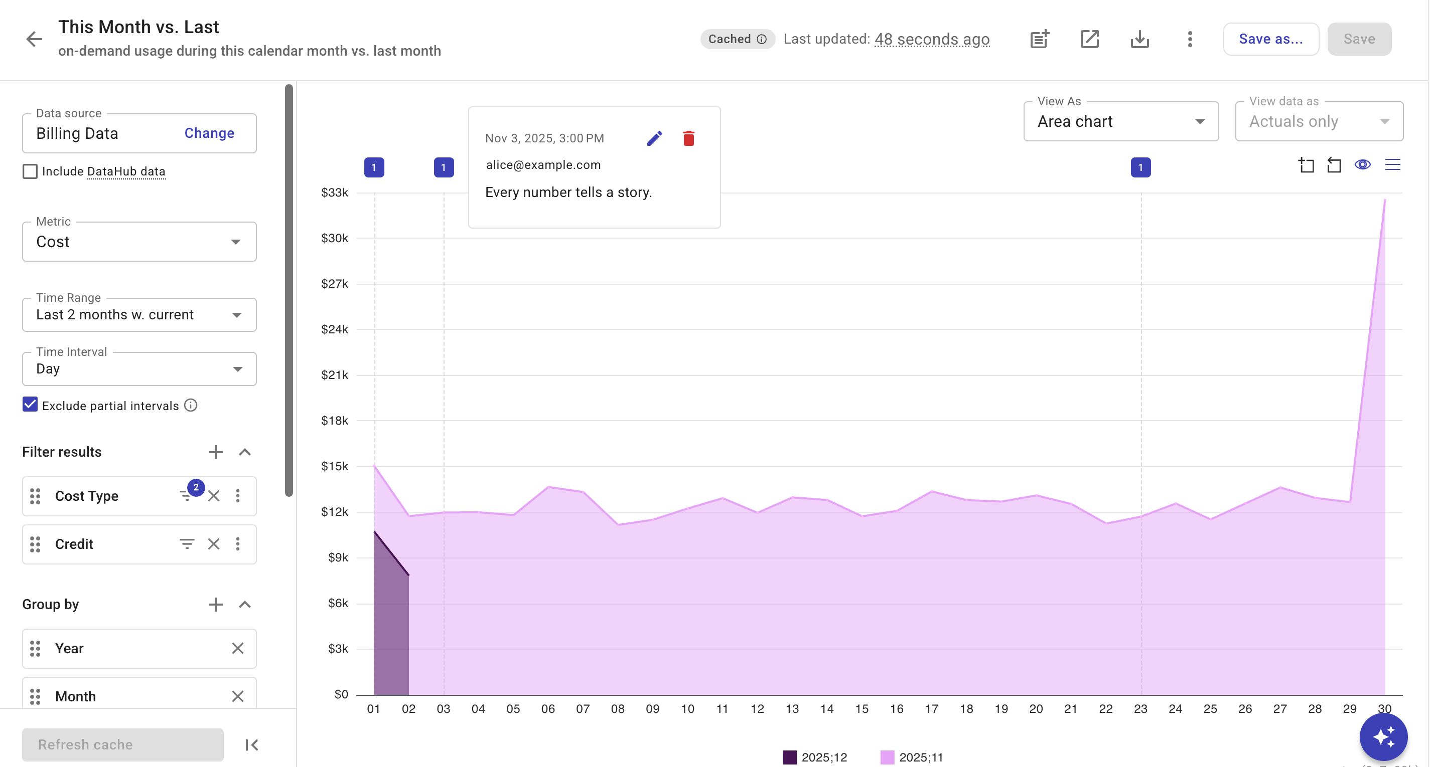 Cloud Analytics(クラウド分析)のレポートに注釈を追加すると、インフラ変更・イベント・アノマリーなど、数値の背景となるコンテキストを記録でき、チームがトレンドをより深く理解して意思決定に役立てることができます。