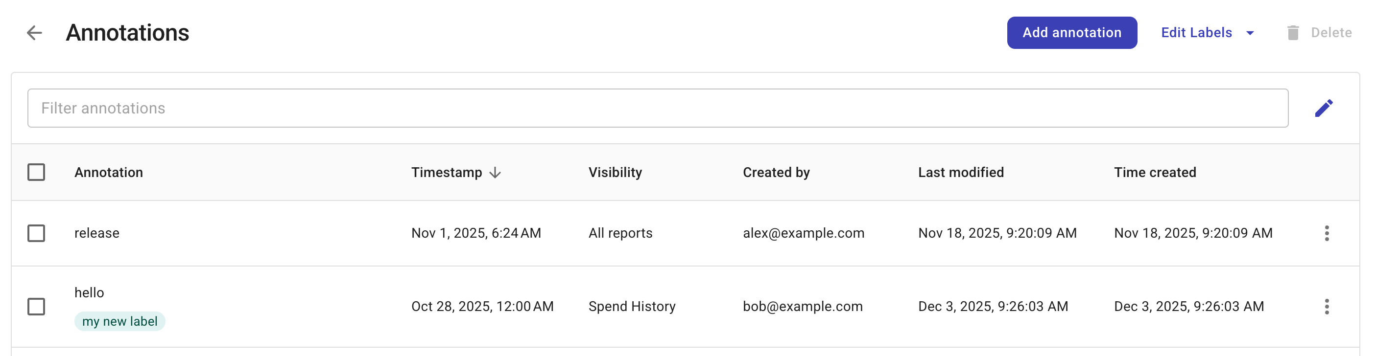 DoiT コンソールでは、専用の注釈ページまたは個別のレポートページで、注釈を追加・編集・削除できます。